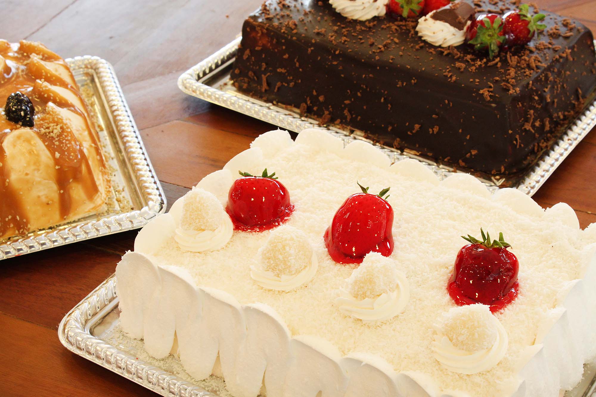pão de ló branco recheado de chantily, creme de baunilha, morango e geleia de morango com cobertura de chantily, morango e xerém de caju |