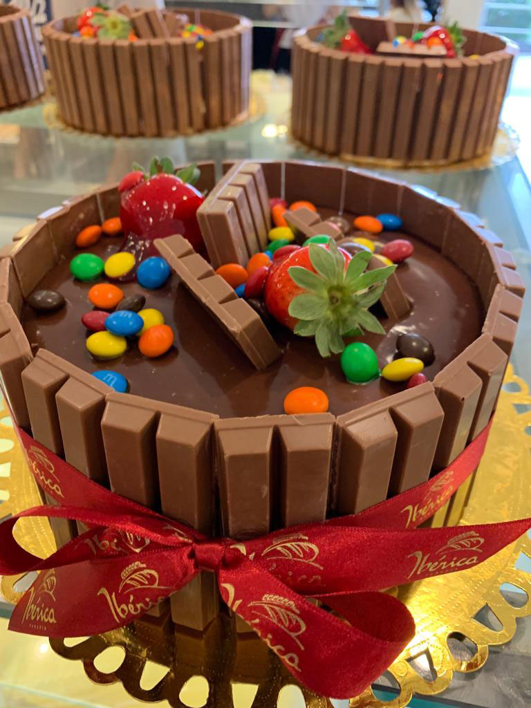 pão de ló de chocolate recheado de doce de leite, flocos de arroz e creme bombom com cobertura de chantily de chocolate, chocolate c/ flocos de arroz e chokito |
